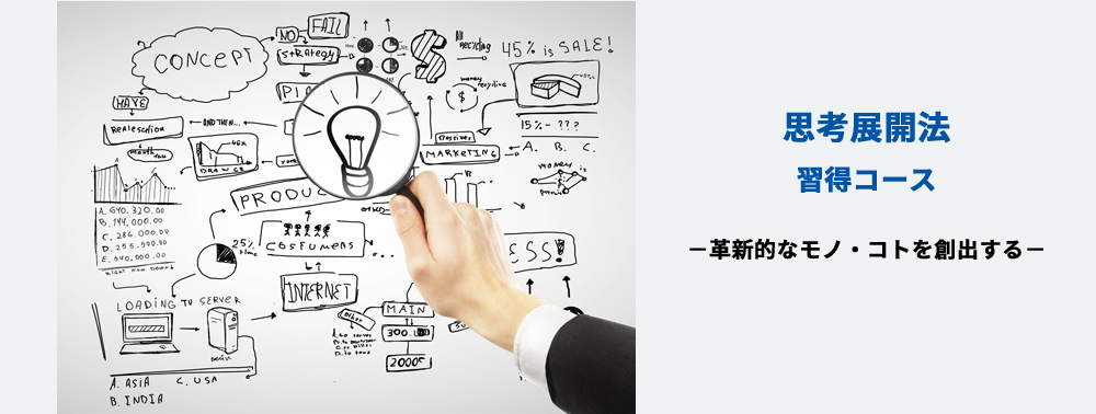 本コースでは、イノベーションを創出するアイディアが出やすい、脳(思考)の状態を達成させるための思考手順体系を学ぶことができます。ここでいうアイディアは、「創出」される場合もあり、「発見」される場合もあります。この思考法の基本は、次々と自問自答していくことにより、自身の脳を活性化させていくことです。そして、「手順にしたがって思考を進めていくと、自然に自分が求める何かを発見してしまう、あるいはアイディアがでてきてしまう」、ための思考手順体系と言えます。この思考手順体系によって発見力や発想力を高め、イノベーション創出に役立てることができます。